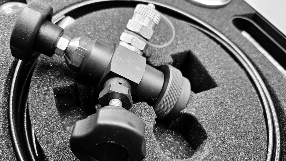 Die DP kommt zusammen mit Anschlüssen und Manometer (Skala von 0-6bar bis 0-600bar frei wählbar) im Schutzkoffer und ist somit immer direkt einsatzbereit.
